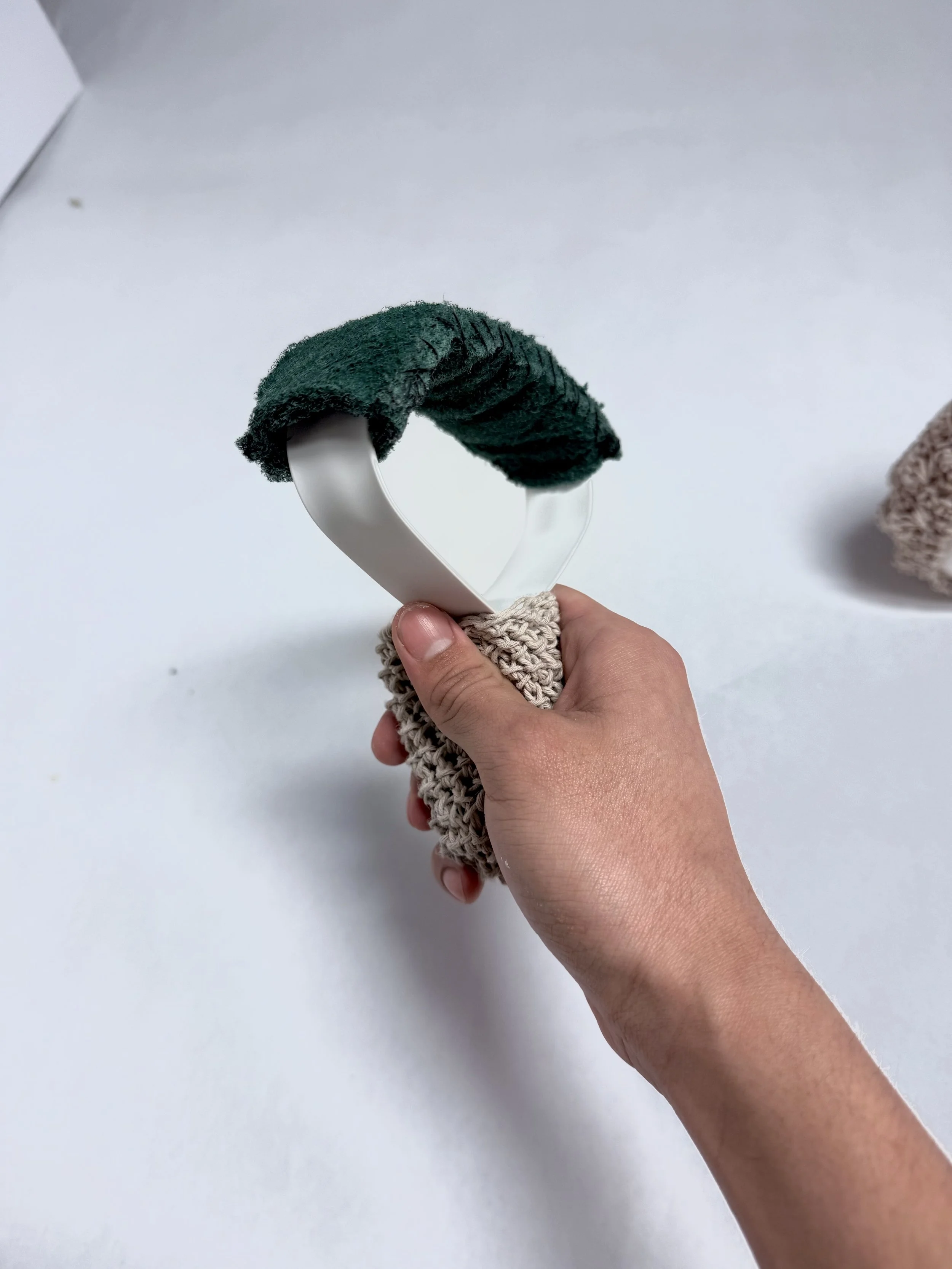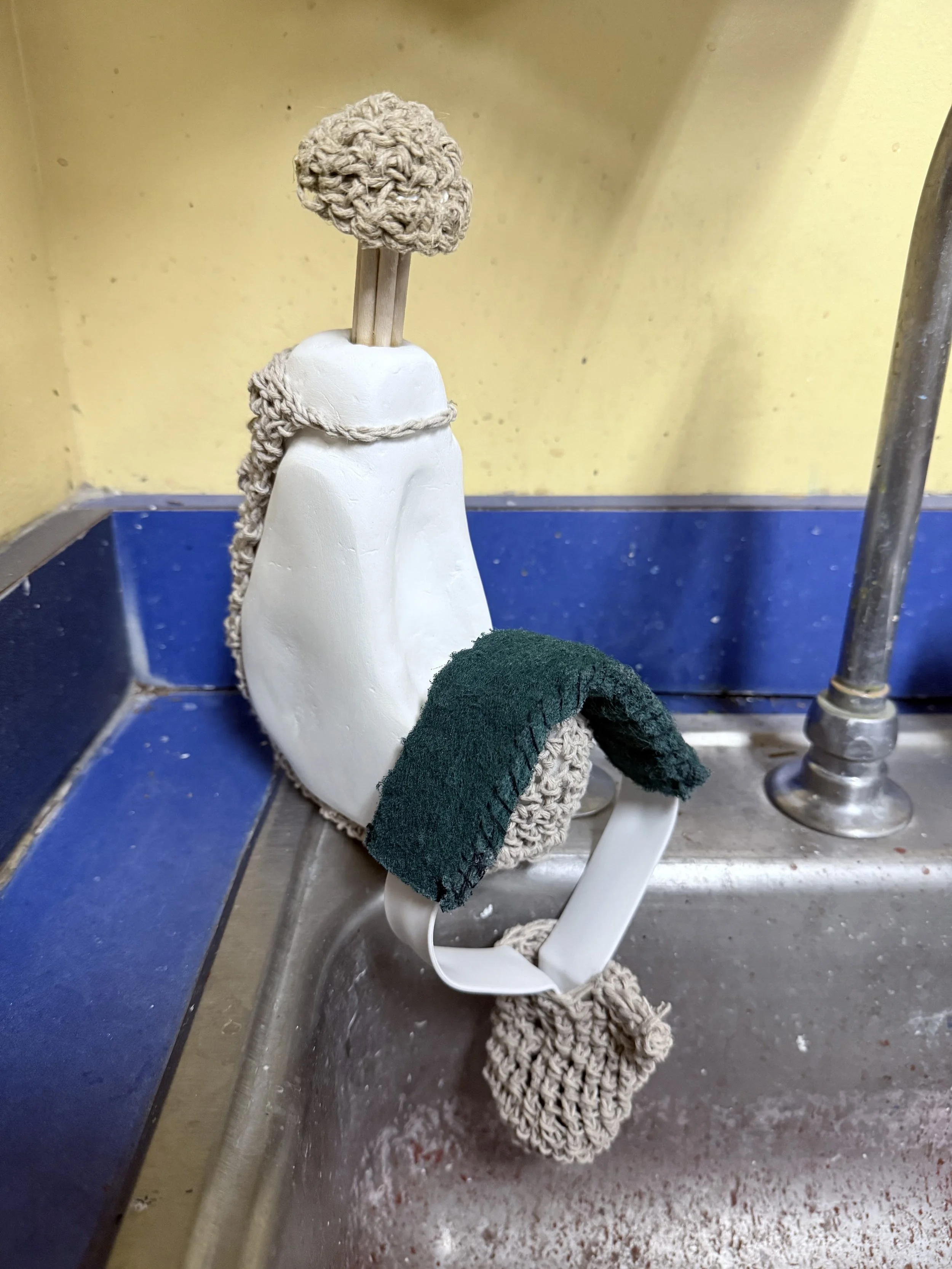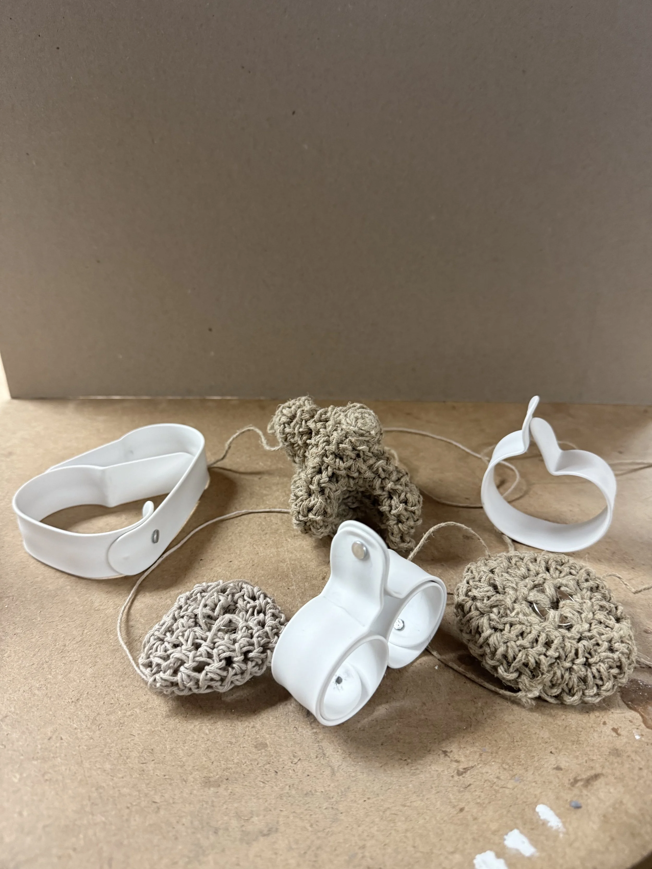 Low-fidelity model making allows for experimentation with material and function; crocheted twine and plaster exude a beachy aesthetic while being texturally pleasing. This phase identified the hanging ledge feature between the dispenser and brush, made with aluminum slap bands, allowing for a flat and wand configuration.